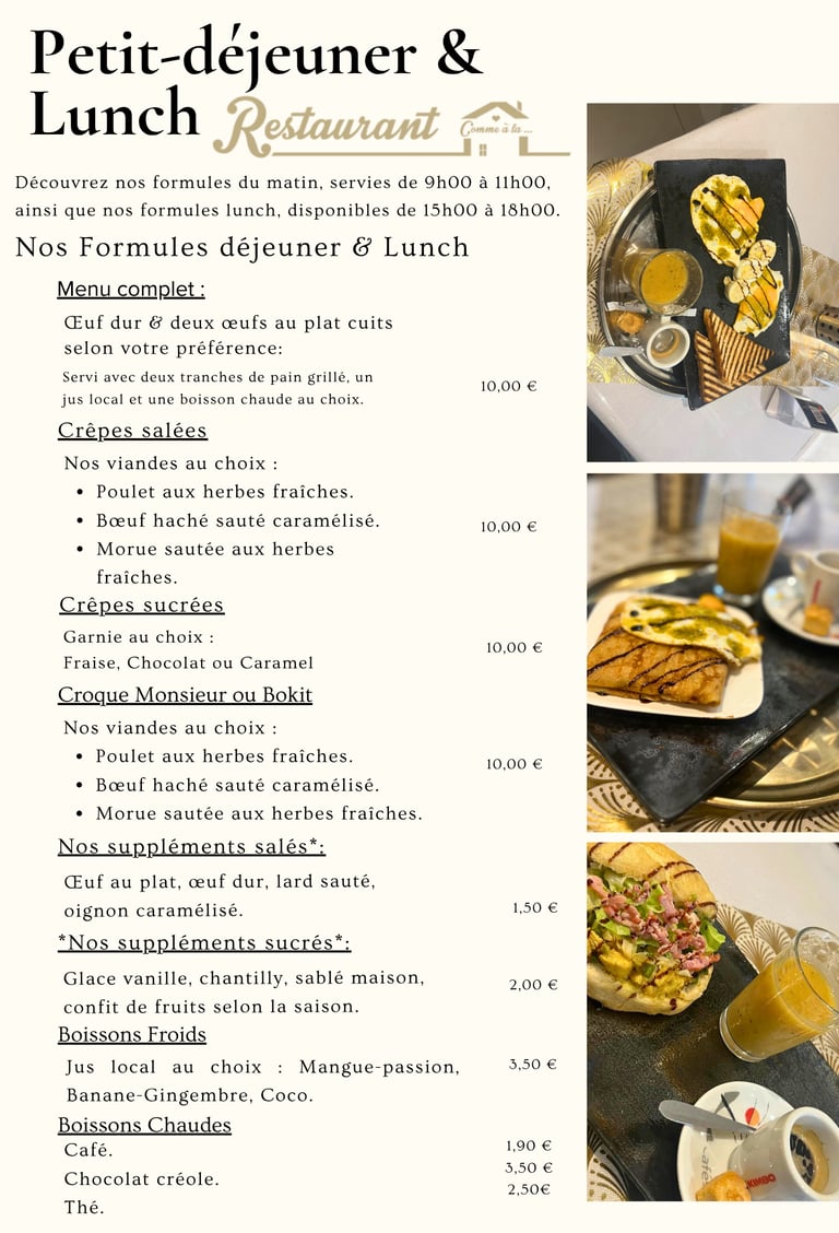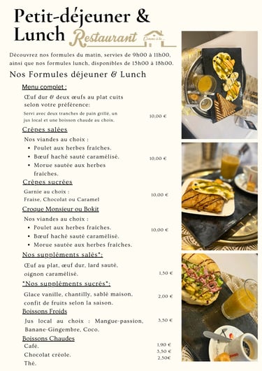 Découvrez notre menu, conçu pour vous transporter au cœur de la Guyane avec des plats authentiques et savoureux. Que vous choisissiez le Porc Frit croustillant, l'Entrecôte Grillée juteuse ou le Tartare de Crevettes frais et raffiné, chaque assiette est préparée avec soin pour vous offrir un véritable voyage gustatif. Nos accompagnements uniques, tels que les frites de patate douce ou le nasi parfumé, et nos desserts maison comme le Crumble Majestueux ou le Beignet de Banane, complètent parfaitement cette découverte culinaire.